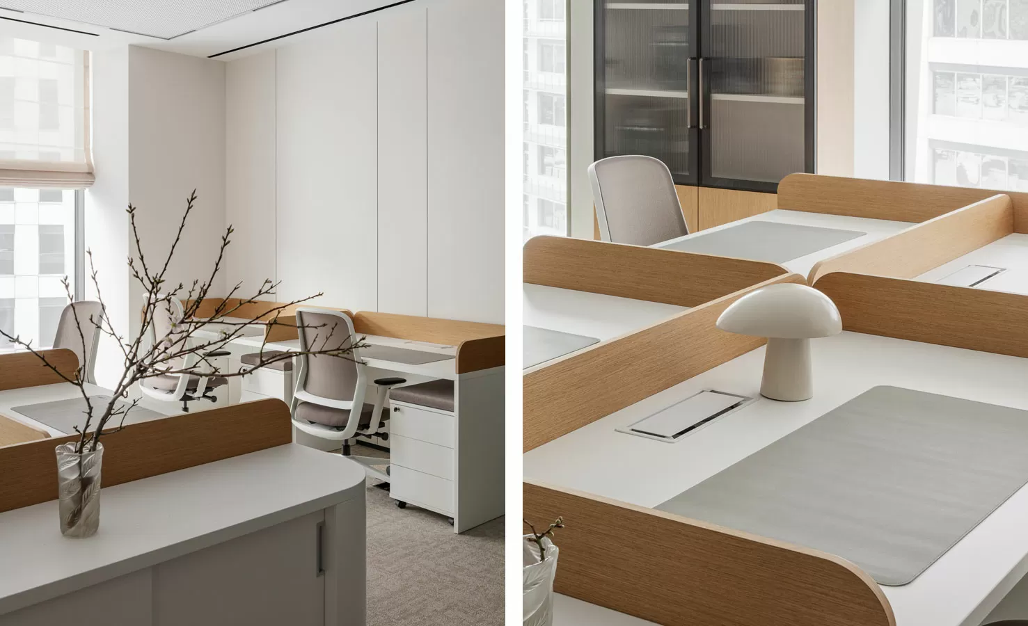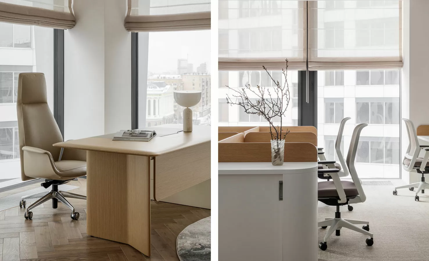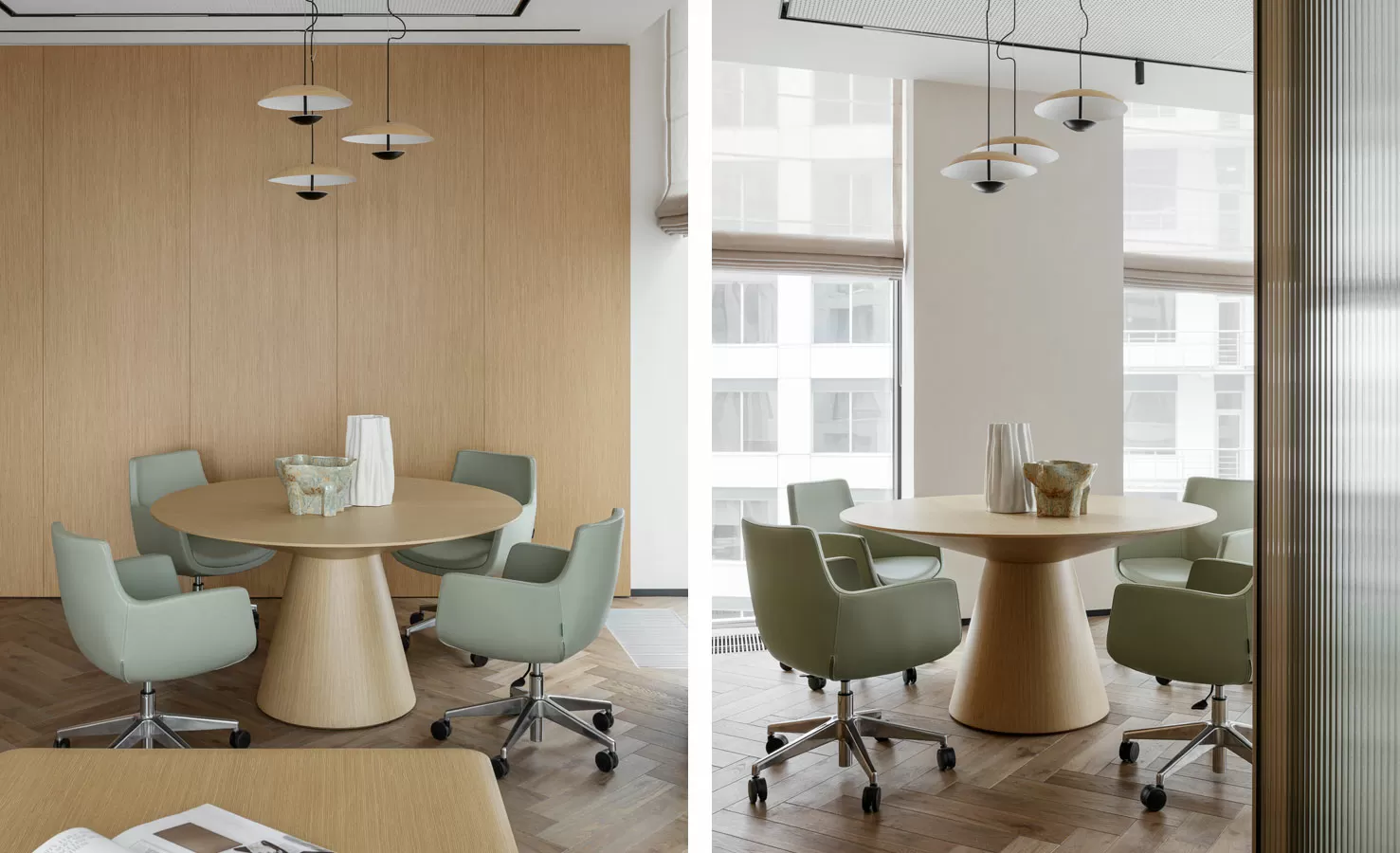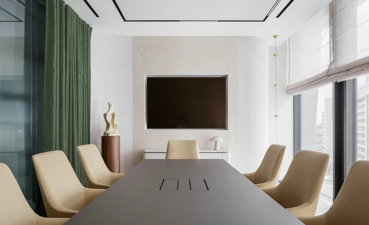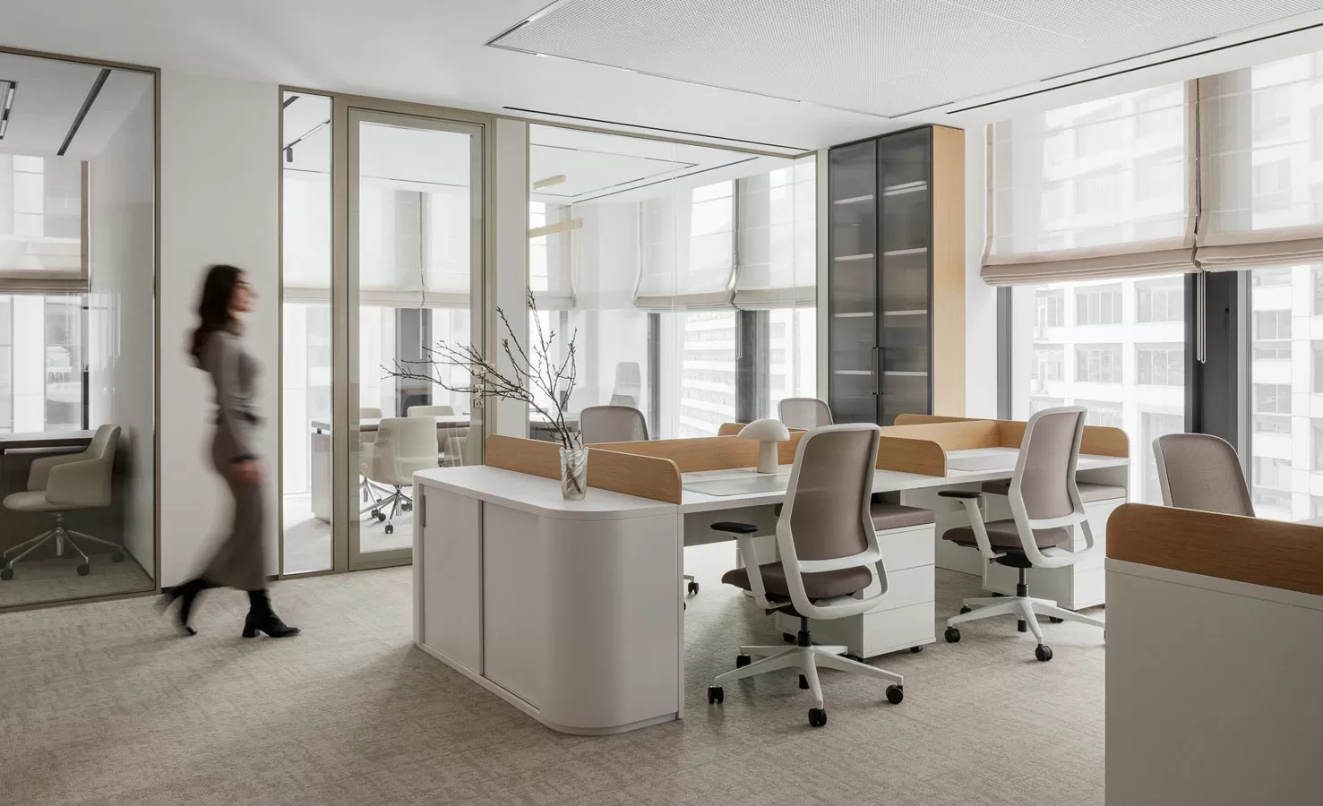 Кастомизированная мебель: стол для переговоров, рабочие столы для руководителей с подкатными тумбами, рабочие станции для сотрудников с экранами, тумбы-греденции в переговорных комнатах от Solo (Россия), столы для переговоров и журнальные столы от TOK (Россия)